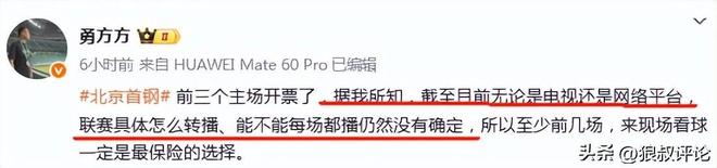 根据媒体人“勇方方”发文:北京首钢 前三个主场开票了,据我所知,截至目前无论是电视还是网络平台,联赛具体怎么转播、能不能每场都播仍然没有确定,所以至少前几场,来现场看球一定是最保险的选择。
